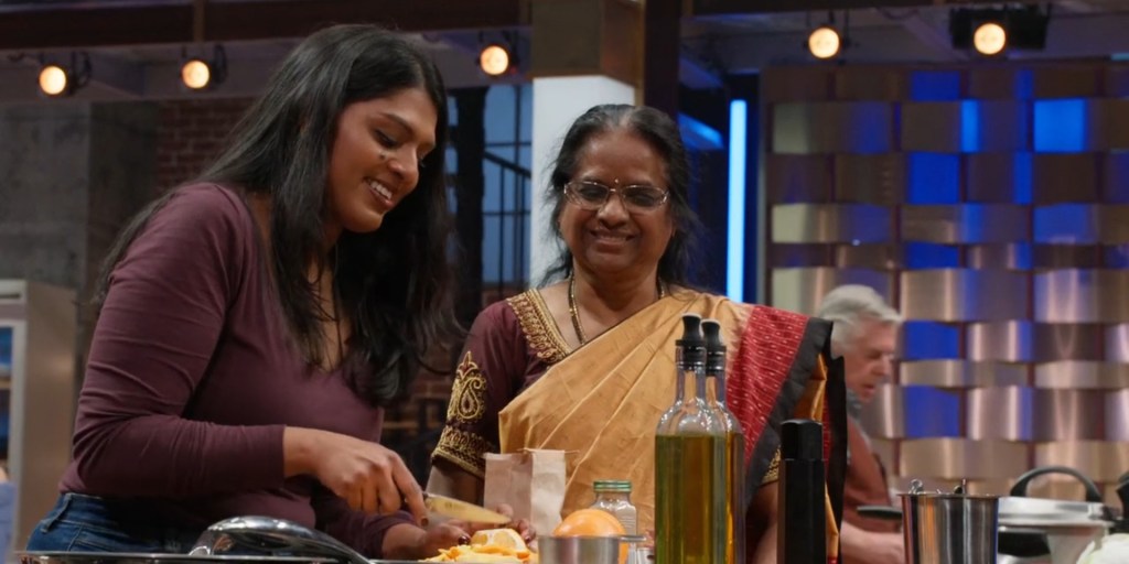 After Foo presents his Vietnamese Egg Rolls to the judges, he discloses that when he and his family immigrated, the people here helped them find work and school for the children. He continues that, although his mother wanted to express her gratitude, she had no money, so she made and delivered these rolls to her friends. Unfortunately, Foo hasn’t brought his mother since she has been diagnosed with dementia. At first glance, Gordon points out that they look quite simple and slightly pedestrian. However, Gordon, Tiffany, and Joe are left impressed by the dish’s refined taste, which helps Foo receive the apron. Next up is Shampa, who has prepared halibut bhuna. Before the tasting, she shares that she was born in Bangladesh and moved to Brooklyn when she was a few months old.