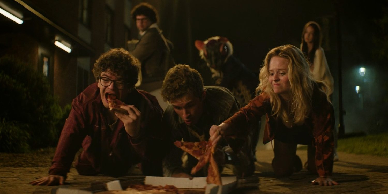 Hulu’s ‘Pizza Movie’ deals with the experiences of Jack, Montgomery, and Lizzy, who experience a drug-fueled, surreal journey at their college campus. Jack and Montgomery accidentally find a box containing an old and powerful drug named M.I.N.T.S, which comes with its fair share of side effects. The unique properties of the drug can only be neutralized by the users if they consume pizza. What begins as a simple plan to get high takes Jack, Montgomery, and Lizzy down a path of impossible visions, hallucinations, and unexpected revelations.